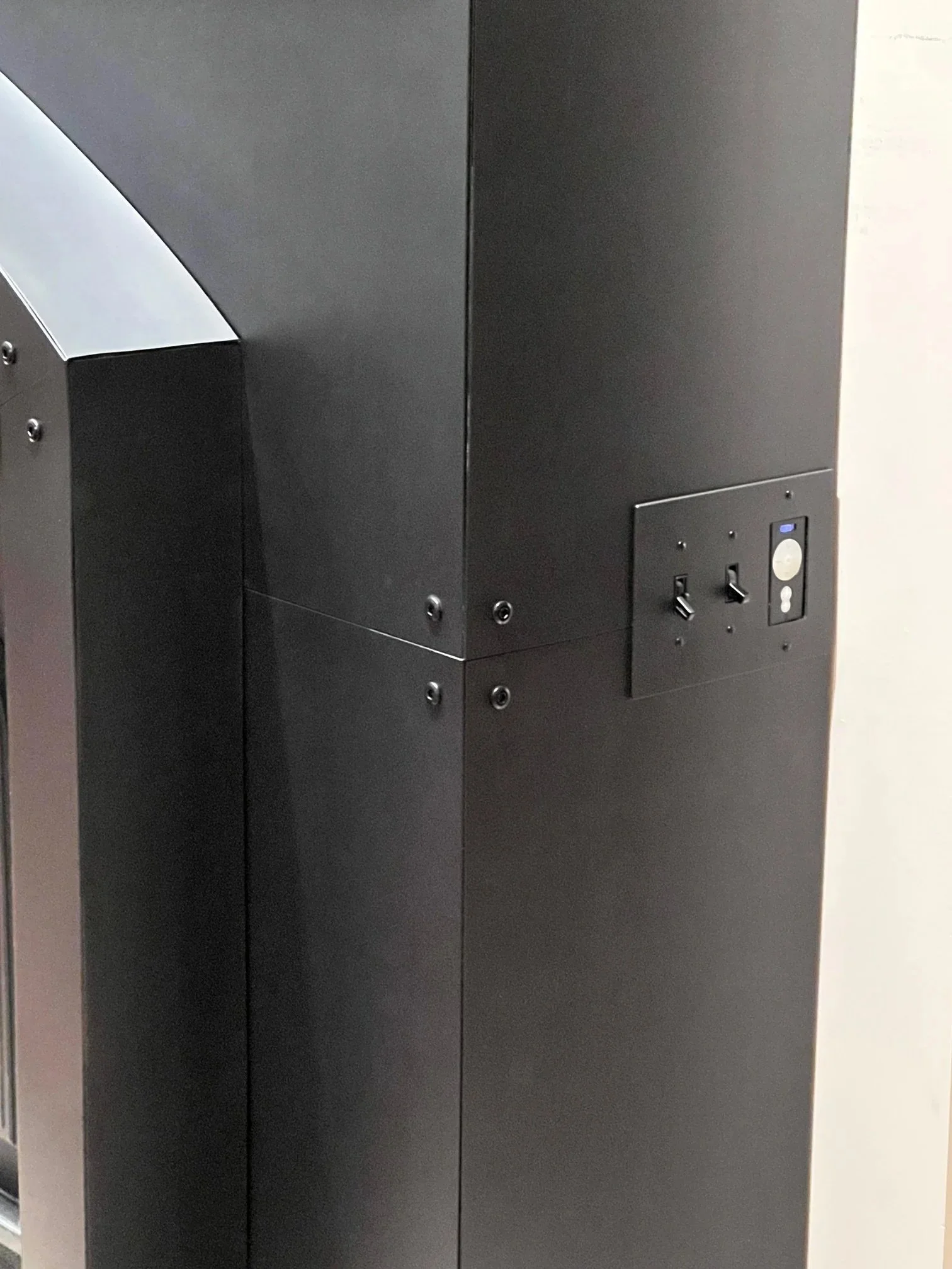 welded steel powder coated structure / laser cut panels with exposed fasteners / fabricated fire box surround and mantle