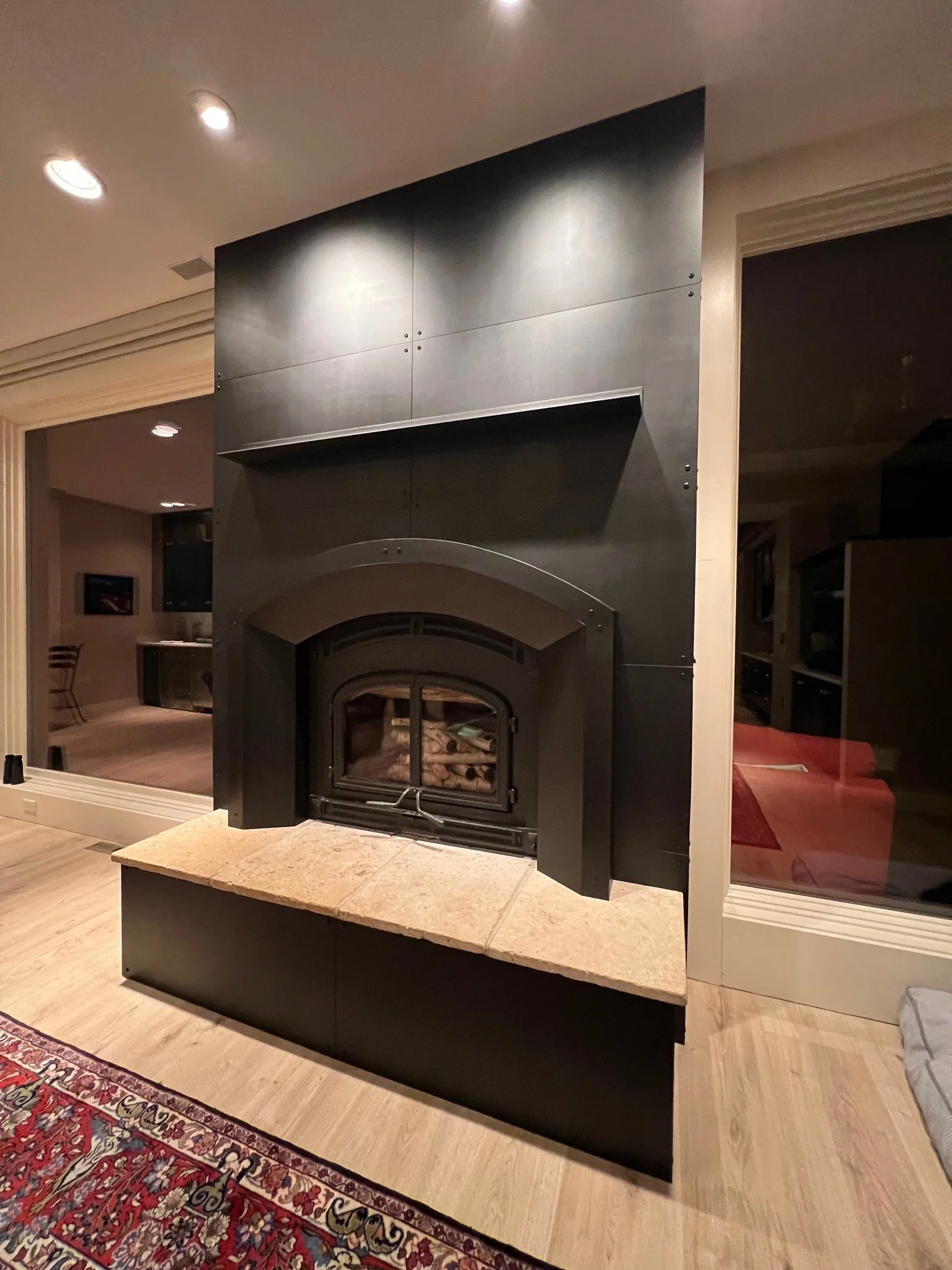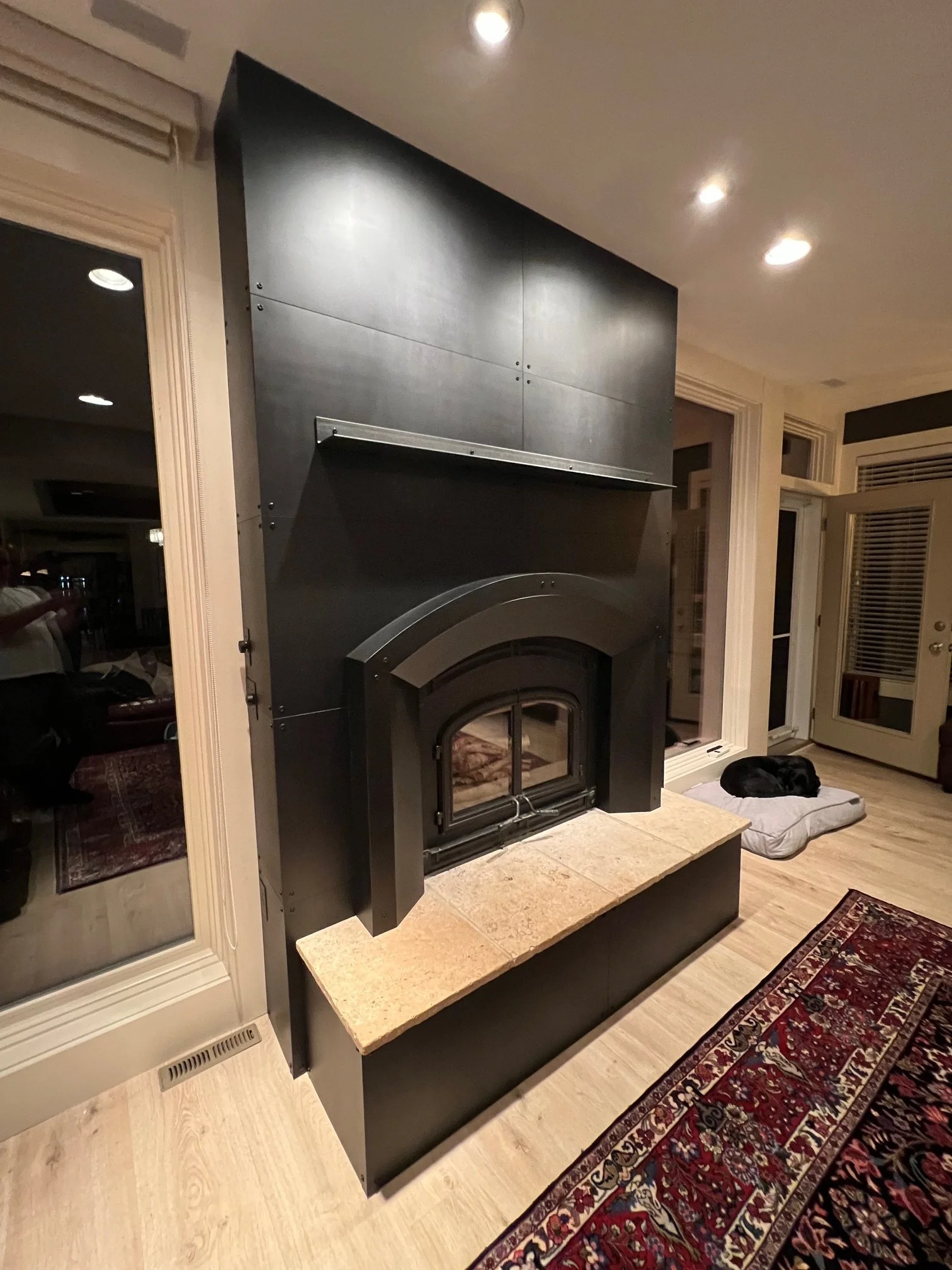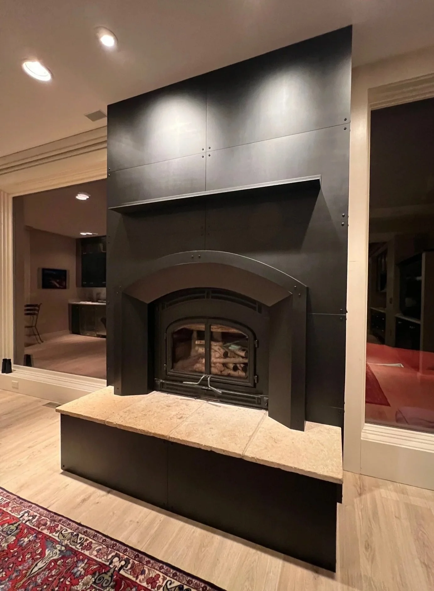 Modern, blackened steel surround built over an existing stone fireplace at a lake home in Madison, WI